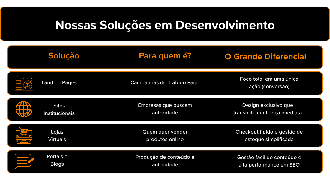 Você acompanha cada etapa do processo e recebe um site pronto para escalar, sem surpresas